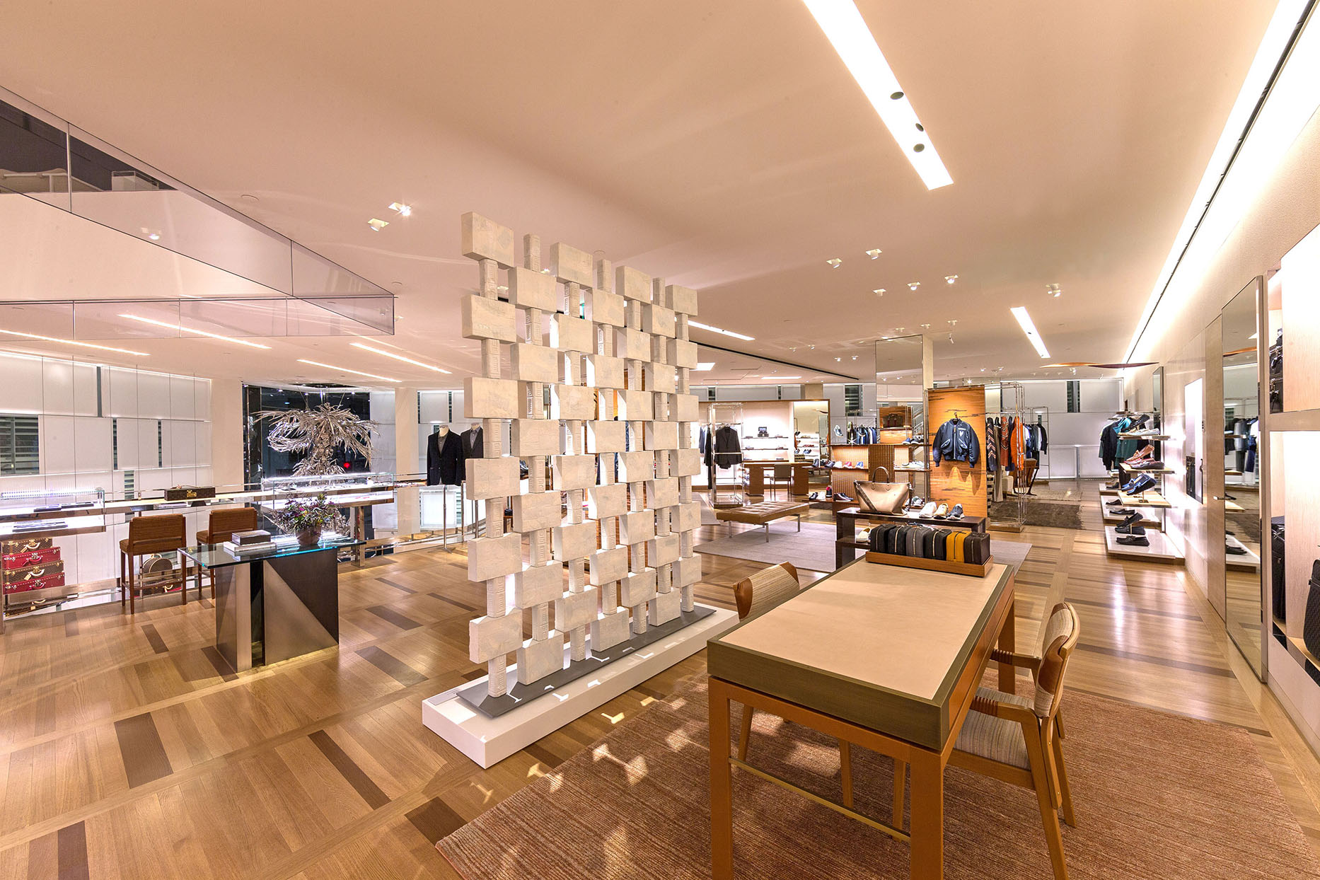 This 15,900 sq-ft retail store is located on a prime corner of Rodeo Drive and Dayton Way. The store is comprised of three retail floors, which display leather products, fine jewelry, and designer apparel by Louis Vuitton Paris. A common theme in the Louis Vuitton leather goods, the stylized floral motif, appears in many iterations in the stores from exotic wood inlays to Venetian plaster reliefs. The Beverly Hills store won an Excellence in Design Award from the Architecture Commission of the City of Beverly Hills.