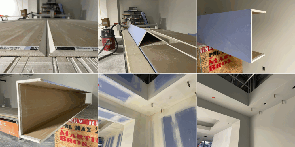Prefabricated drywall shapes speed up project timelines while elevating visual impact. From soffits and curtain pockets to column wraps, curves, and detailed features, each piece is custom-designed and built to spec in our off-site facility. We utilize multiple specialized routers to create a wide range of profiles, allowing us to accommodate virtually any shape or design you envision. This not only ensures precision and design consistency—it also minimizes on-site clutter and streamlines installation.